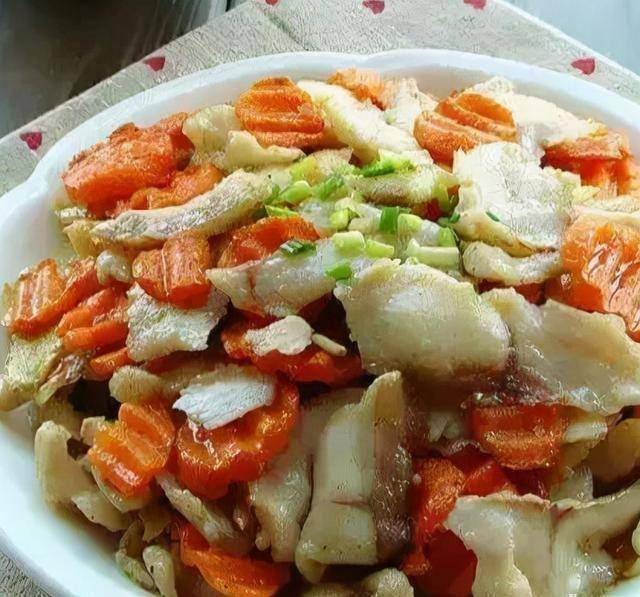 材料:鱼,胡萝卜,酒,葱、蒜、辣椒、猪油、调味料各少许。