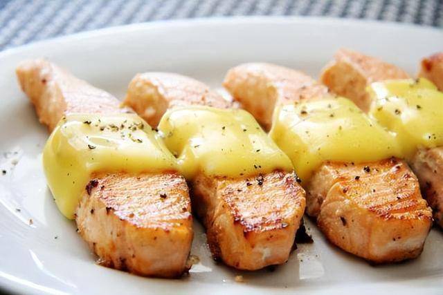 7、 将煎好的三文鱼码入盘中放即食芝士片,送入烤箱焗20秒