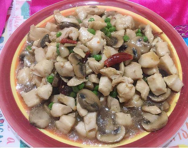 3、先炒鸡丁,鸡丁出香味变色后放入蘑菇丁翻炒;