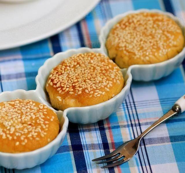 取一块面团,捏结实、搓圆、压扁,放上适量的红糖或者白糖