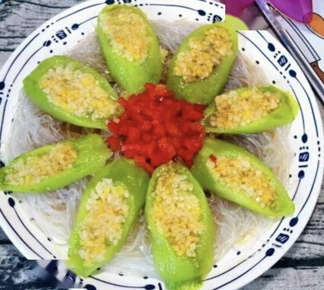 泡好的粉丝沥干水,铺在盘底,上面铺丝瓜片,放入红椒丁,把熬好的蒜汁均匀浇在丝瓜片上。