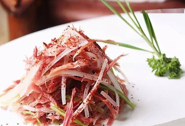 把腊野猪后腿肉放清水锅里先煮熟,待捞出来撕成丝后,加香菜节和大葱丝拌匀了装盘,最后撒些辣椒面上去便成。