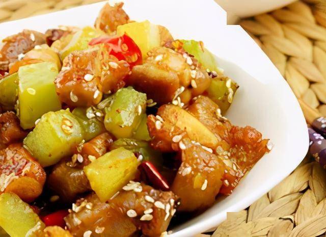 翻炒组合:加入莴笋丁翻炒,再放入炸好的鸡丁,加盐、糖调味,淋少许生抽炒匀;