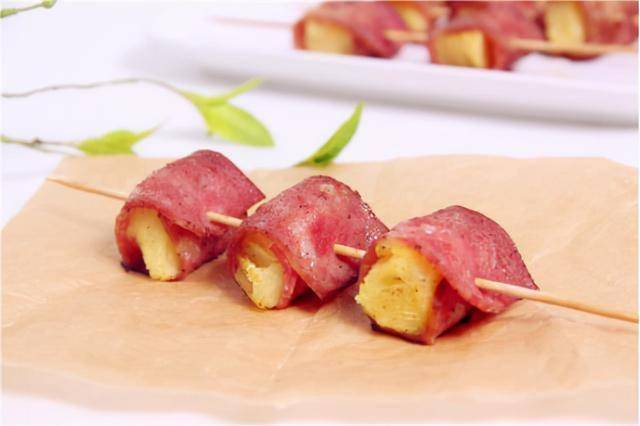 食材:培根5片、香水菠萝1/3个、烧烤汁1汤匙、红糖半匙