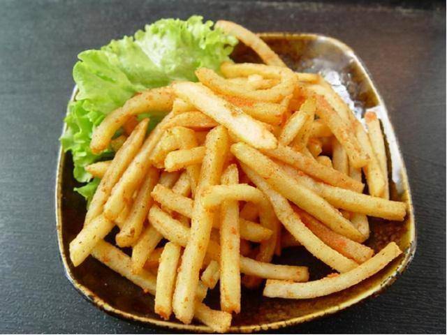 5、油温六成热时下入土豆条,边晃动锅边用筷子翻动,炸到金黄出锅控油,就炸好了。