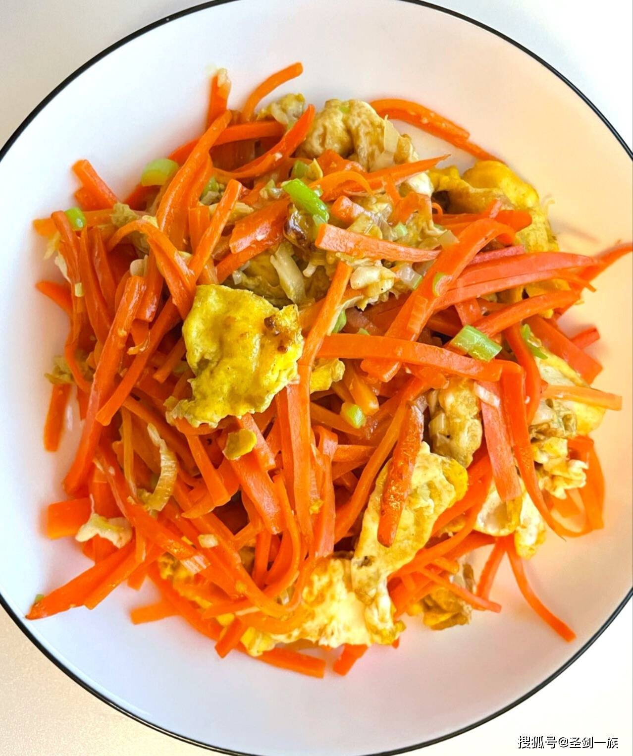 要点:胡萝卜切成细丝,鸡蛋炒成蛋花,与胡萝卜丝一同翻炒。