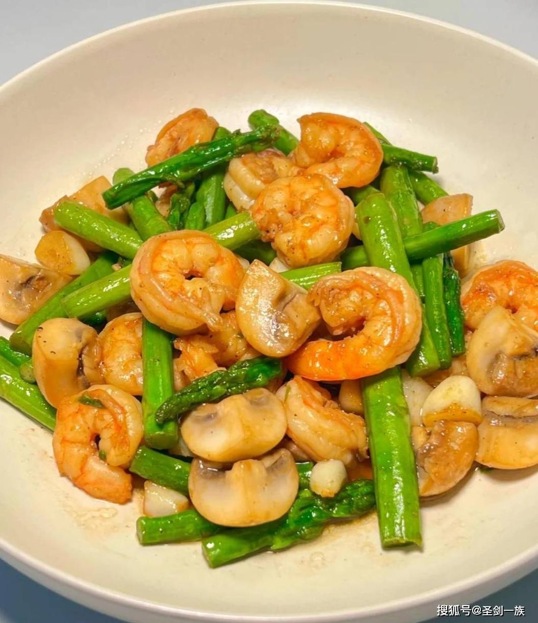 要点:芦笋焯水后过凉水,虾仁先腌制去腥,快速翻炒。