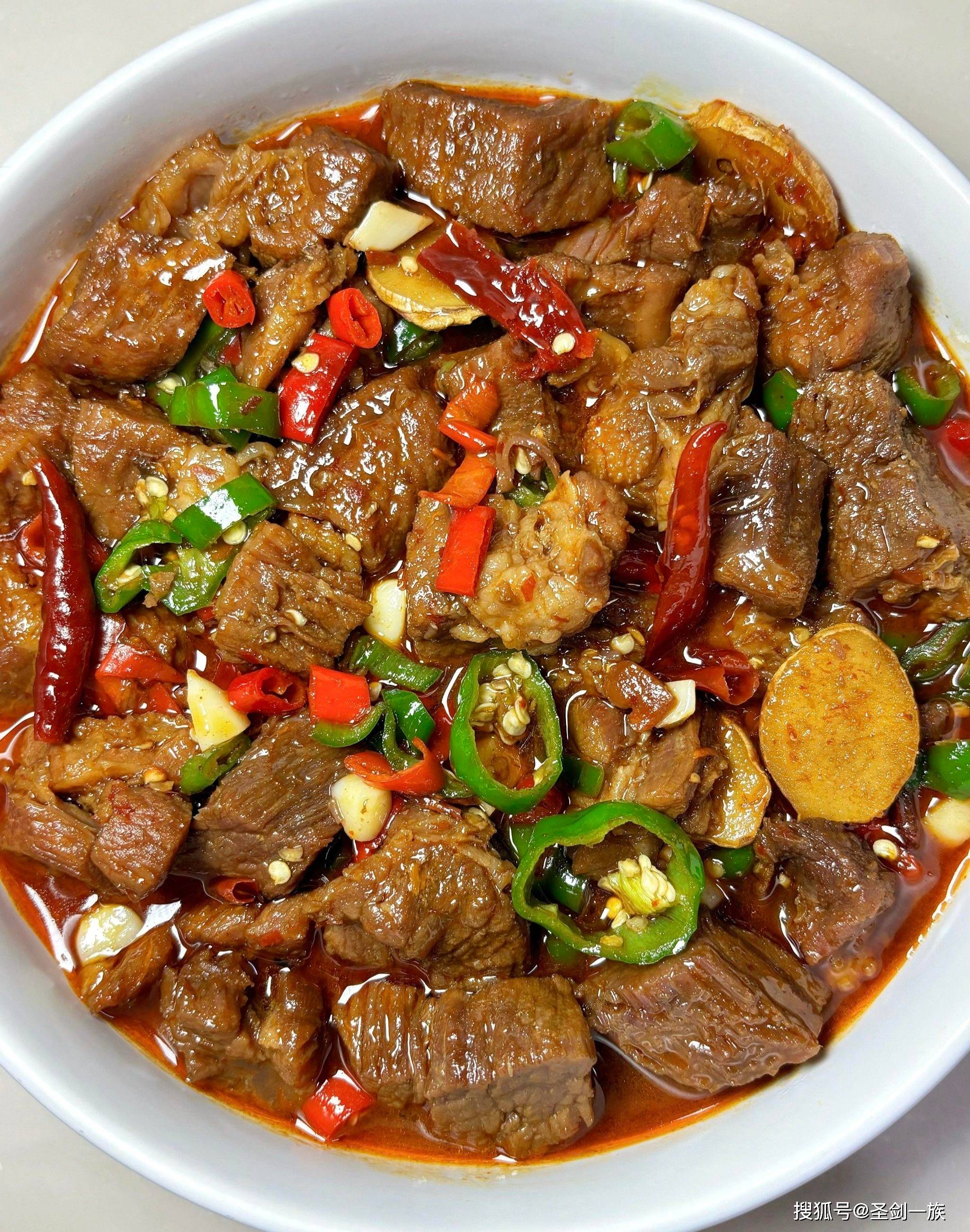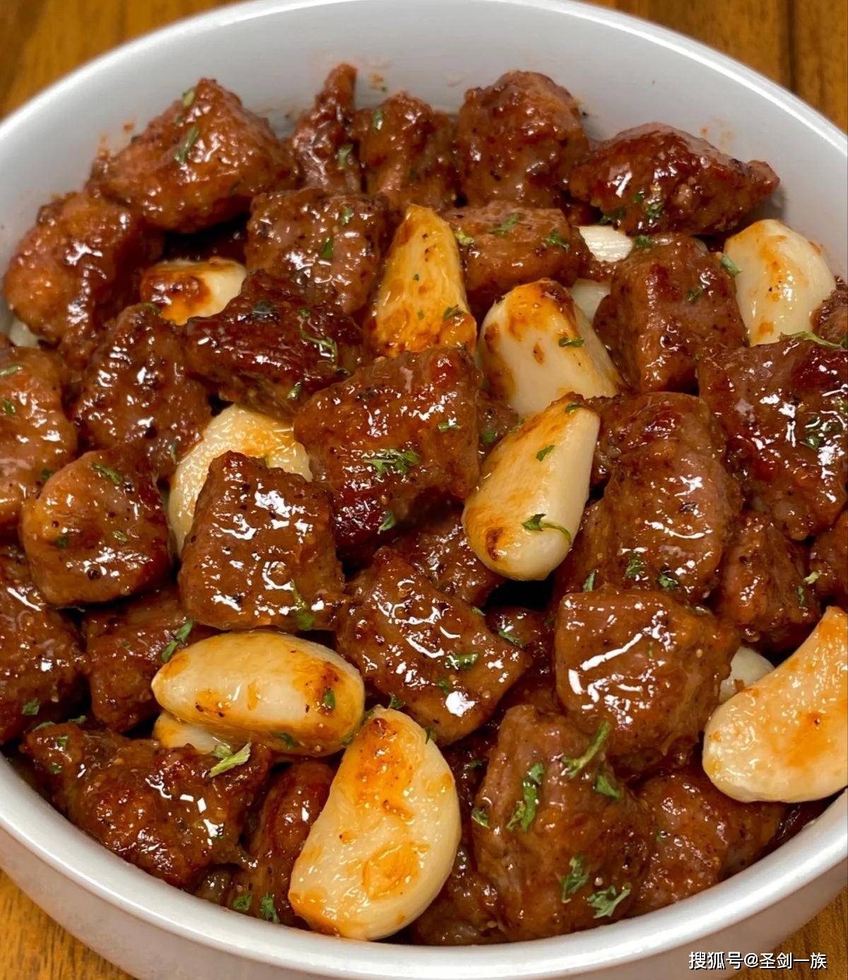 要点:牛肉腌制后快速翻炒,蒜瓣炸至金黄,与牛肉一同炒制。