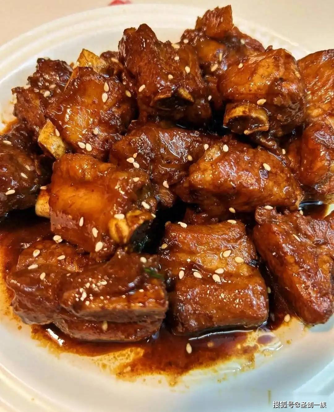 所需食材:猪肋排500克、冰糖30克、香醋3勺、生抽2勺、料酒2勺、生姜3片、大葱半根、八角1个、盐适量、白芝麻适量、食用油适量。