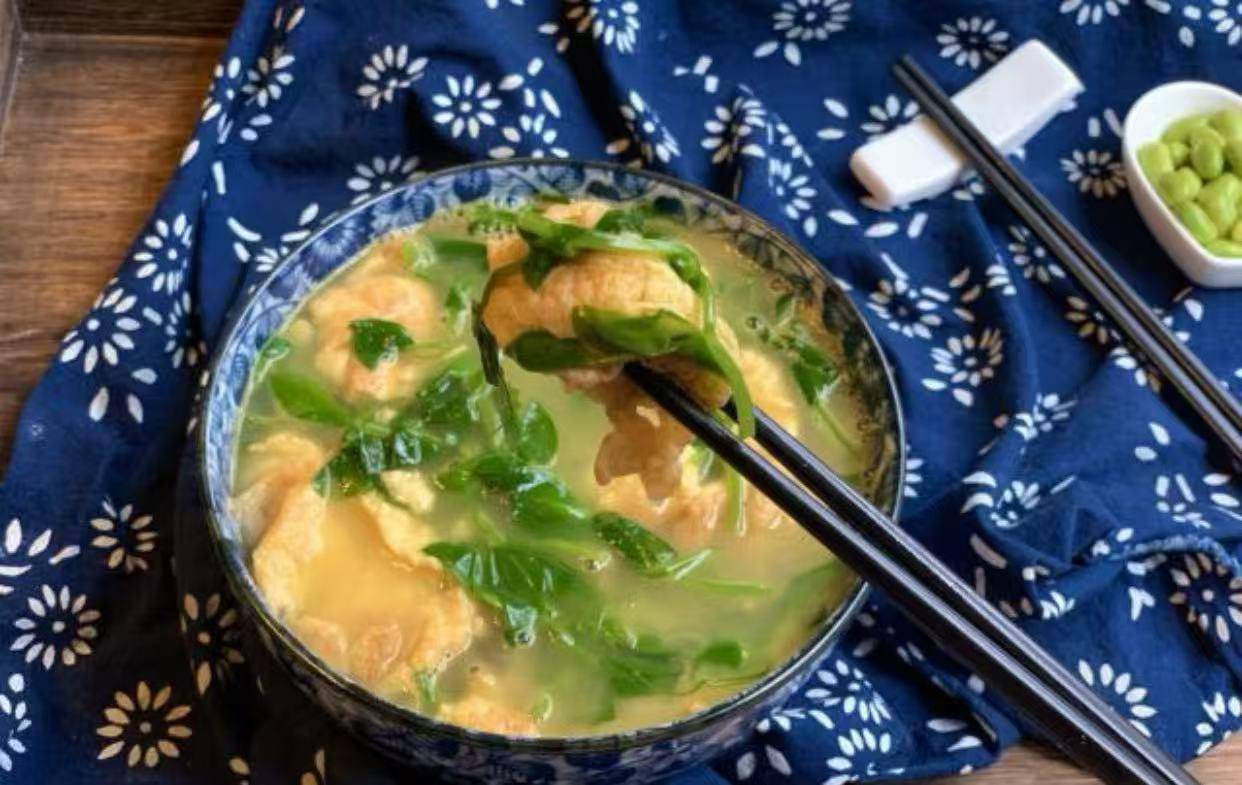 2. 豌豆尖煎蛋汤:豌豆尖的清甜与鸡蛋的香滑相结合,煮成汤后既能暖胃又能提供足够的营养,是一道适合全家人的春季汤品。