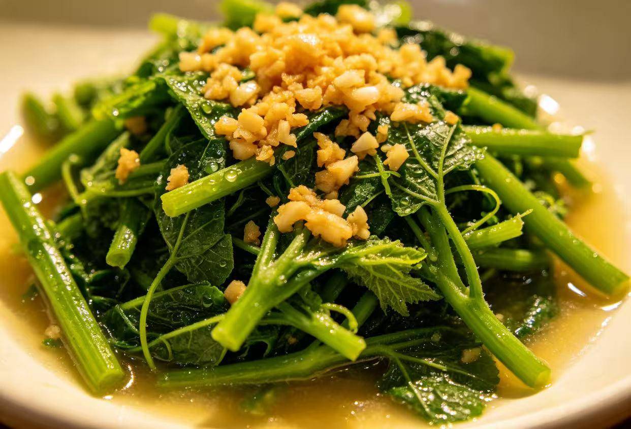 4. 蒜蓉红薯苗:红薯苗的鲜嫩与蒜蓉的香浓相结合,清炒后既保留了食材的原味,又增加了菜肴的风味,是一道简单又下饭的家常菜。