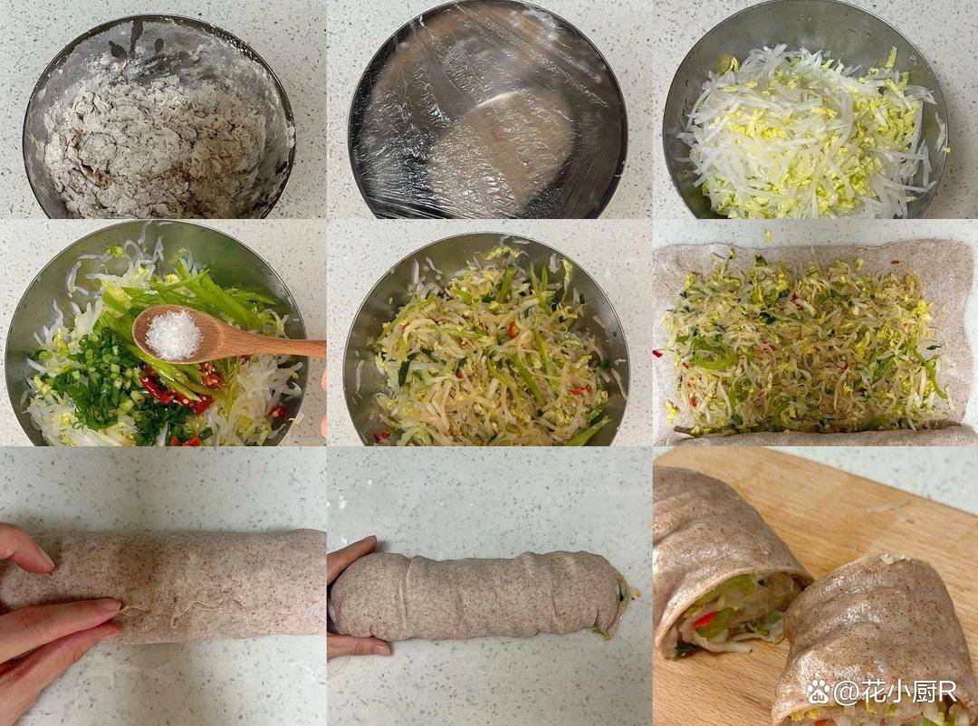 ✅ 亮点:春天我常做黑全麦萝丝菜卷:黑全麦粉搭点白面粉,卷进脆嫩的萝卜丝和圆白菜丝。这些食材做了两条菜卷,切了8块,吃1块才100大卡,饱腹感极强。黑全麦的麦香扎实,时令蔬菜清甜爽口,低脂低卡,既有碳水也有膳食纤维,当早餐吃太方便啦!