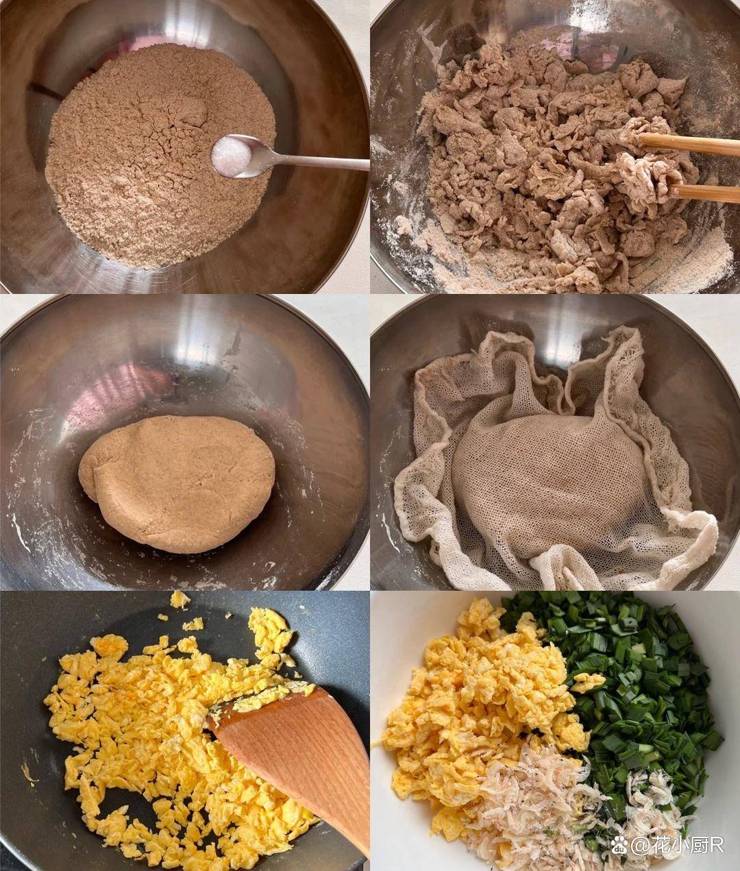 1️⃣面粉加盐、一边倒温水一边用筷子搅成絮状,然后揉成团醒发的时间去做馅;