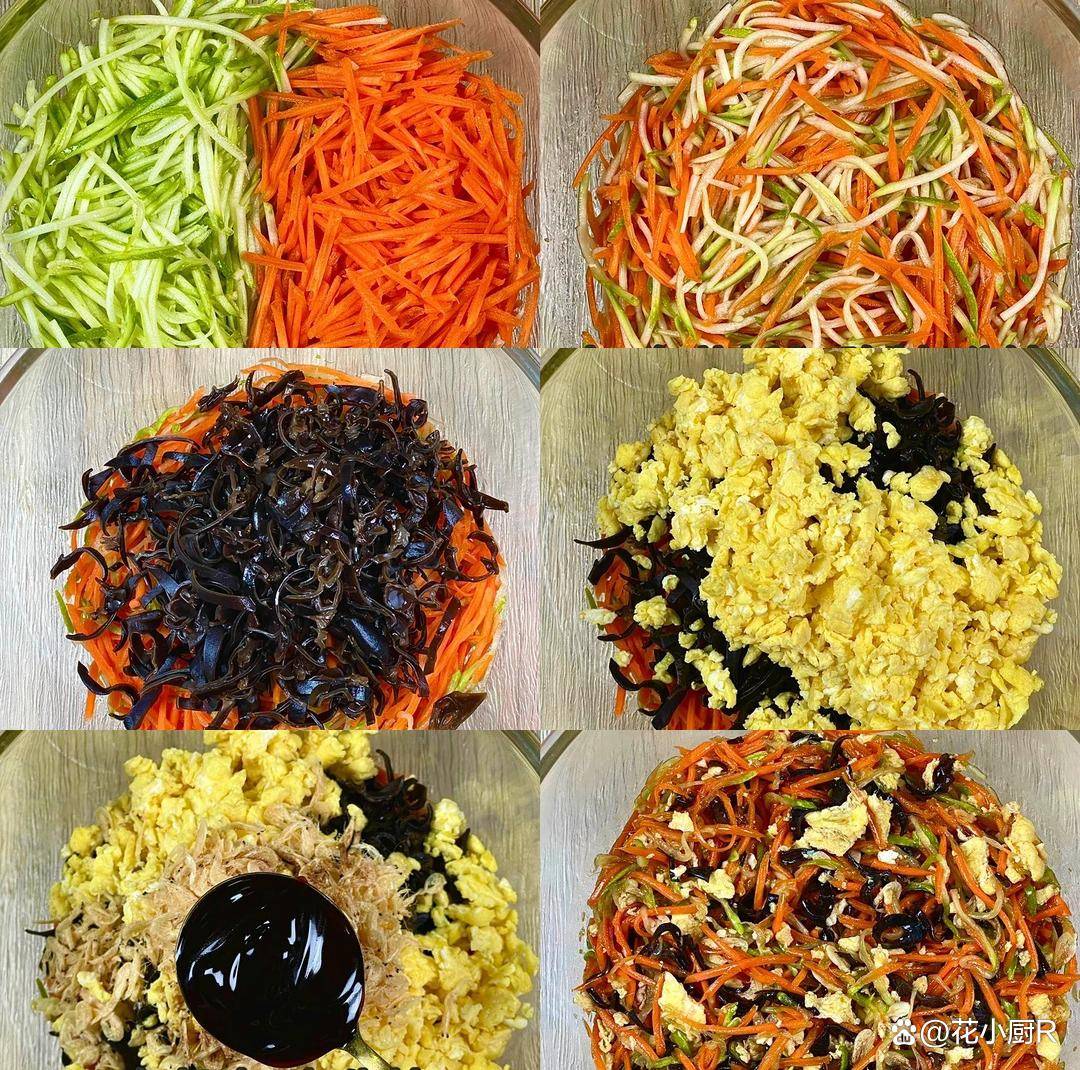1️⃣准备西葫芦丝、胡萝卜丝,加一勺盐抓匀腌制15分钟,挤干多余水分;