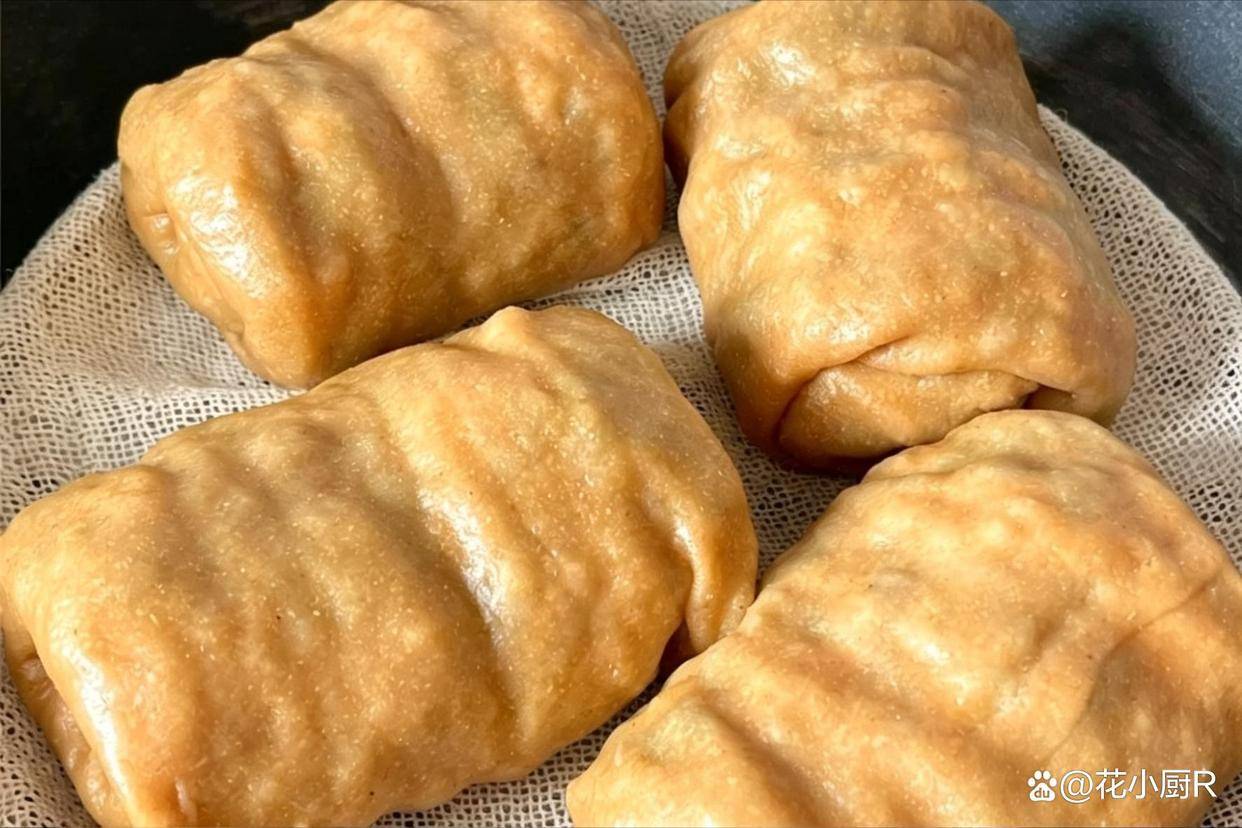 3️⃣醒好的面团揉一下,分成五个55g左右的剂子,取一个剂子擀成饺子皮厚度的薄饼,按照图示卷起来,水开后上锅蒸10到15分钟即可。