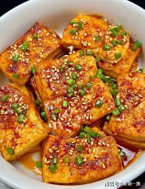 3、锅中倒油煎豆腐,翻面,煎至金黄倒入调好的酱汁,收汁,撒上辣椒粉和孜然粉。