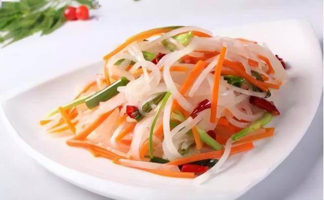 食材:白萝卜350克、胡萝卜50克、花椒3克、盐适量、醋5克、鸡粉3克、糖3克