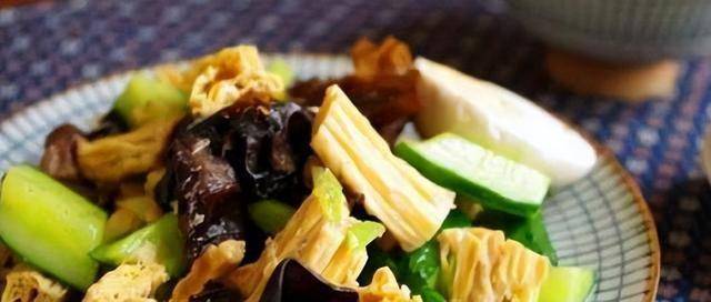 食材:腐竹,木耳,黄瓜,葱花,酱油,糖,盐,淀粉,
