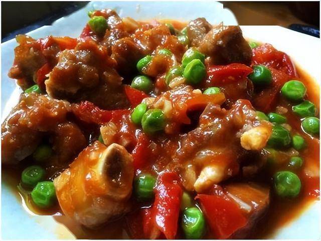 材料:小排、豌豆、大蒜、葱、姜、盐、醋、生抽、蚝油、番茄酱、糖、白酒 、油