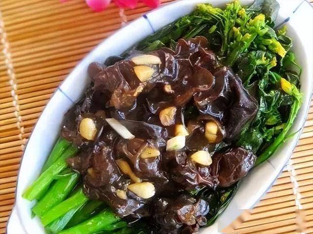 材料:黑木耳100克、芥蓝300克、花生油1汤匙、食盐1汤匙、大蒜2粒、蚝油2汤匙、生抽2汤匙、淀粉1汤匙、鸡精1/2汤匙
