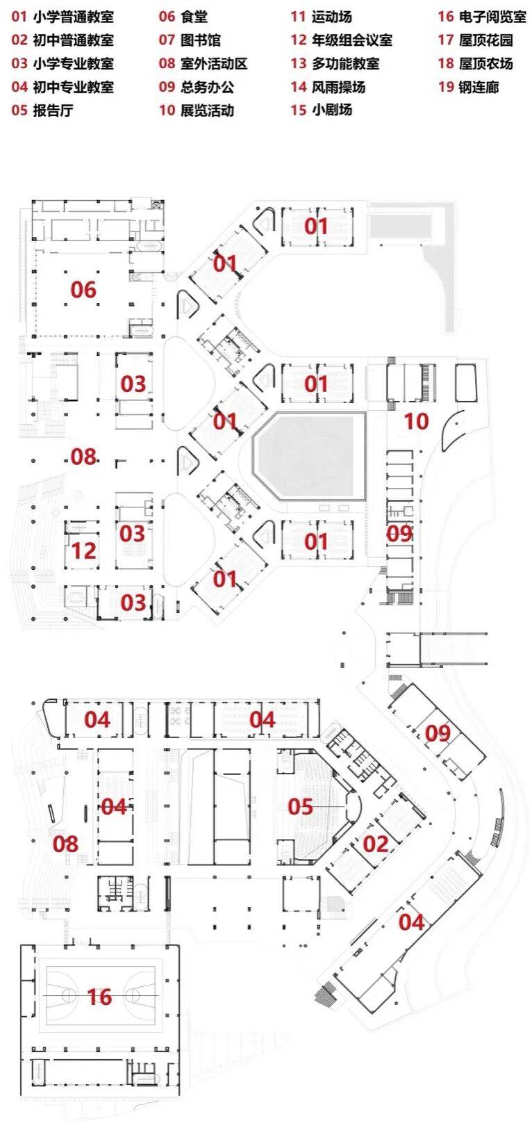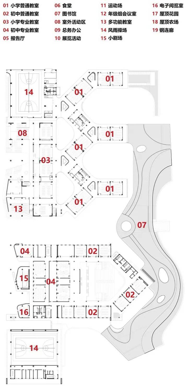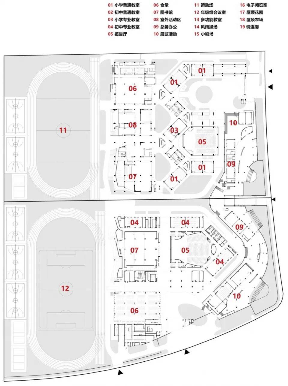 3. 差异的呈现:差异是K12学校的核心关键和人文主义的体现。幼儿园相对独立,小学和初中相邻。单元式的小学和集中式的设计回应了不同年龄段学生特征。巨大的西侧公共空间也体现差异,小学部分突出互视让孩子相互学习,初中部强调不同空间并置突出成长活动差异,构成建筑的表情。