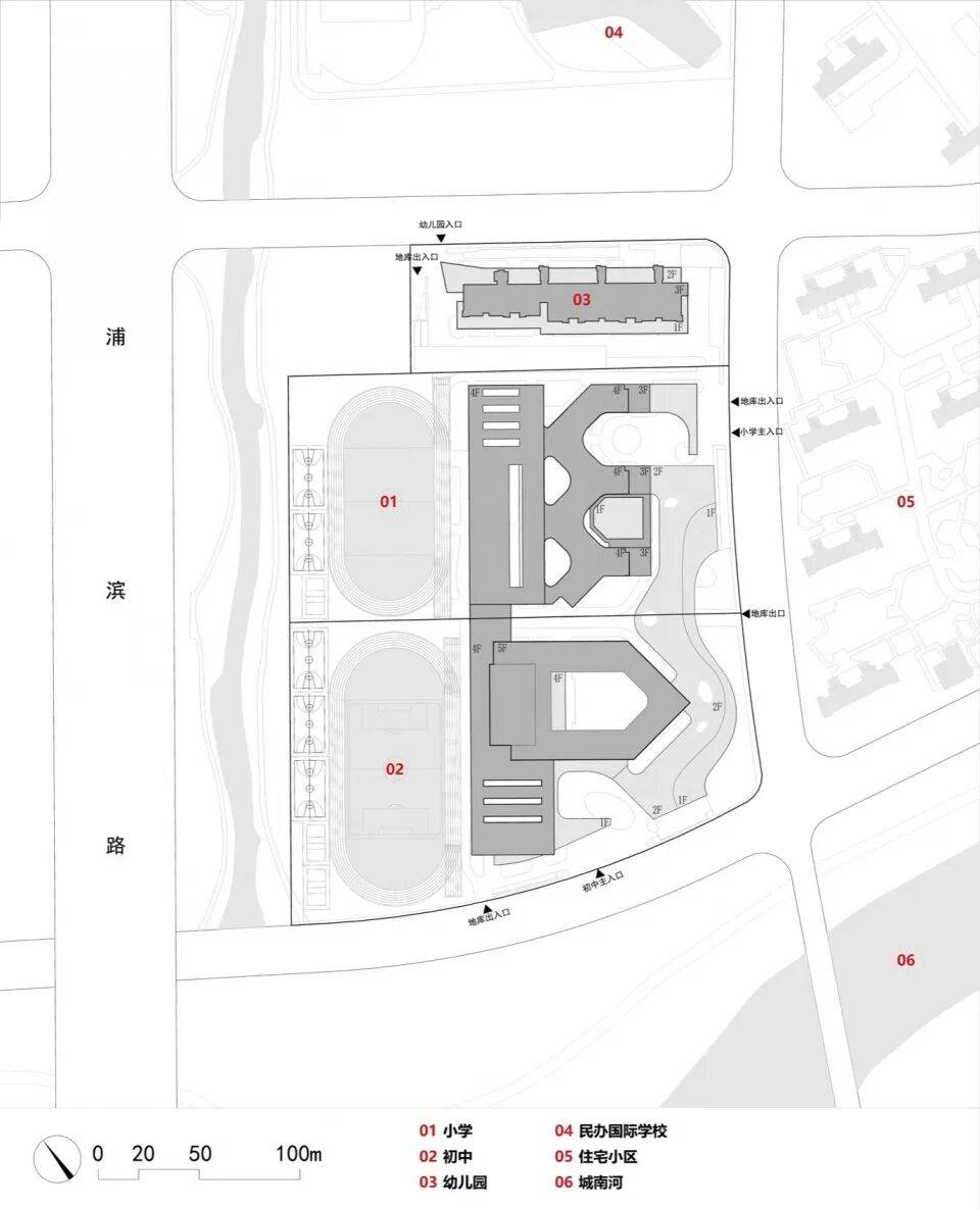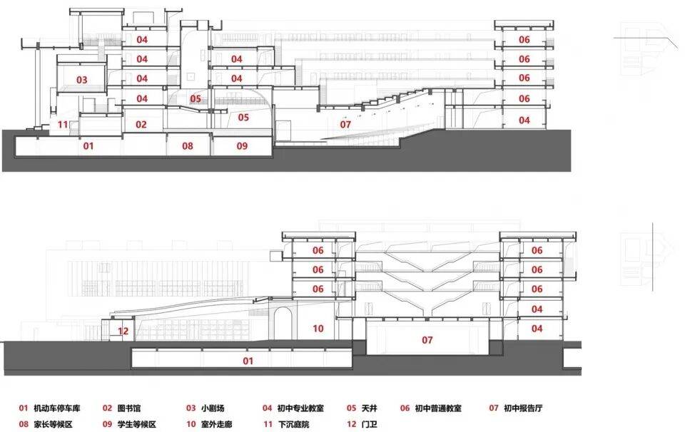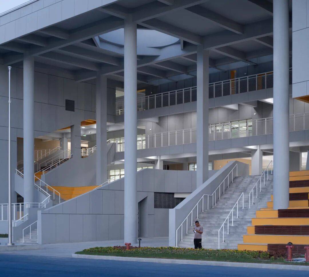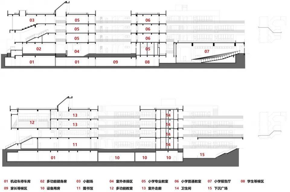 3. 差异的呈现:差异是K12学校的核心关键和人文主义的体现。幼儿园相对独立,小学和初中相邻。单元式的小学和集中式的设计回应了不同年龄段学生特征。巨大的西侧公共空间也体现差异,小学部分突出互视让孩子相互学习,初中部强调不同空间并置突出成长活动差异,构成建筑的表情。