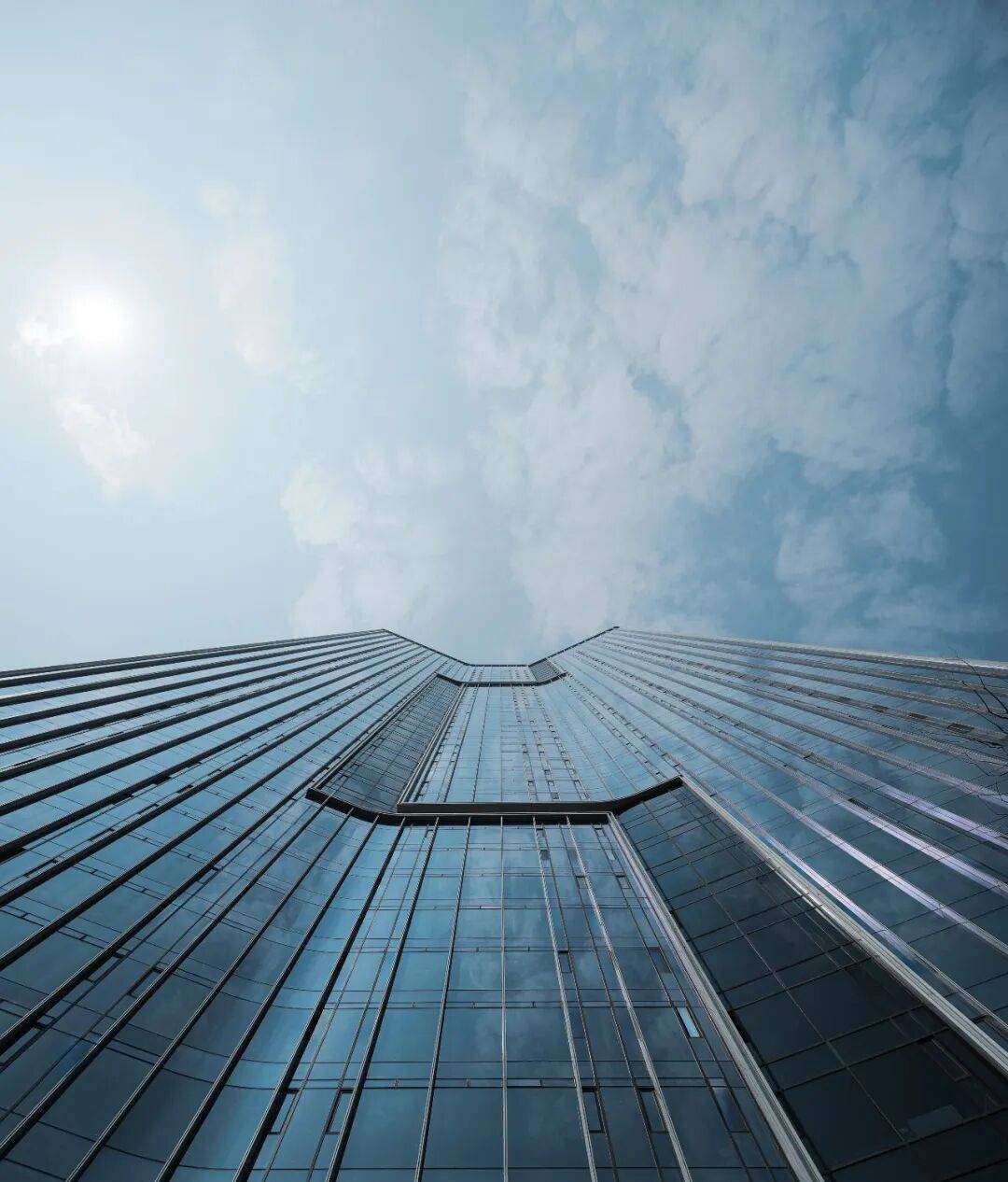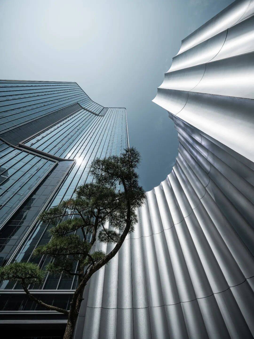 3. 独特的建筑立面设计:建筑立面以两个简洁体量交错咬合,形成深邃内凹折线,与建筑轮廓呼应,在不同时间与视角下呈现丰富光影变化与形象剪影。立面以纵向铝板装饰条搭配Low - E玻璃构成基本语言,在体量咬合处巧妙转化为横向线条,形成鲜明视觉反差。住宅排烟窗经系统化模数设计,尺寸与位置完美对齐竖向线条,化为立面秩序一部分。建筑西北侧立面利用玻璃幕墙装饰条渐变密度,将百叶、设备平台、管线等复杂机能消隐于深色幕墙背景中,确保整体形象完整统一。