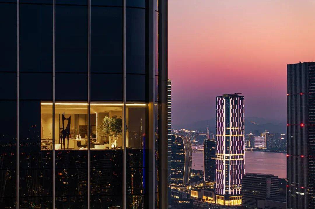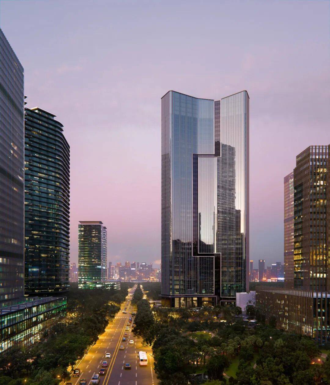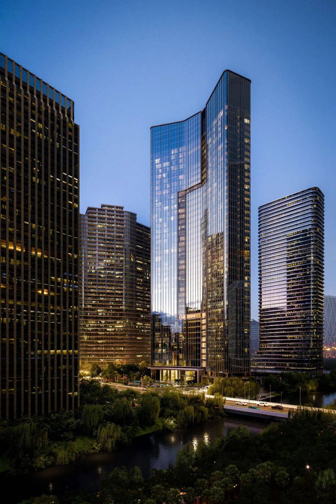 2. 多元业态的高效梳理:项目包含底层酒店、上方超平层公寓及顶层跃层豪宅。设计通过梳理车行与人流动线,高效分离三类人流,入口处以高低错落雨篷延伸主楼建筑语言并形成直观视觉引导。首层立面选用黑色石材、铝板与Low - E玻璃,传递沉稳商务气质,同时通过细腻肌理为办公与归家赋予兼具效率与温度的抵达体验。