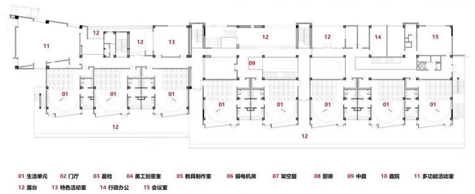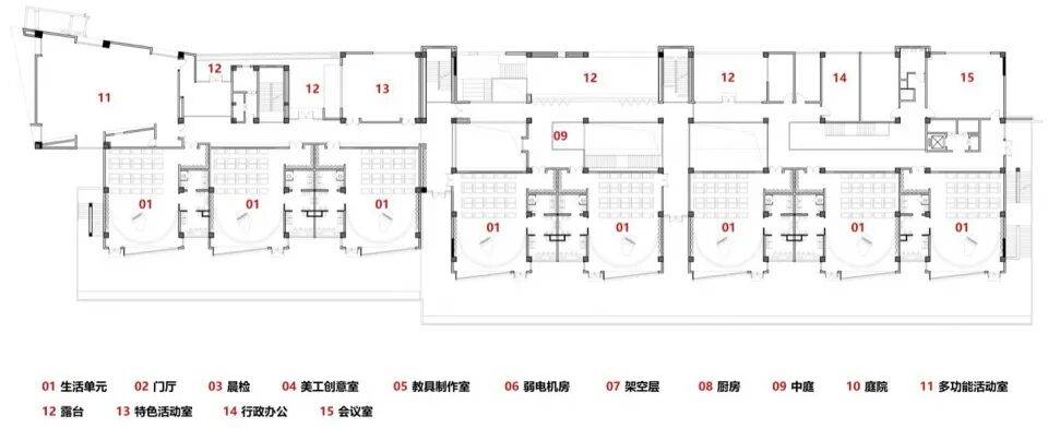 1. “三明治式空间结构”:该结构是对未来教育模式的直接回应。以常规教学班为核心主体,一侧布局艺术教育空间,另一侧承载实验与拓展类课程,形成功能清晰、层次分明的复合教育场景。同时,为多方协作提供了稳定框架,不同建筑师在整体秩序下进行差异化设计与表达,既保留了空间细节的丰富性与多样性,又维持了整体形态的统一与协调。