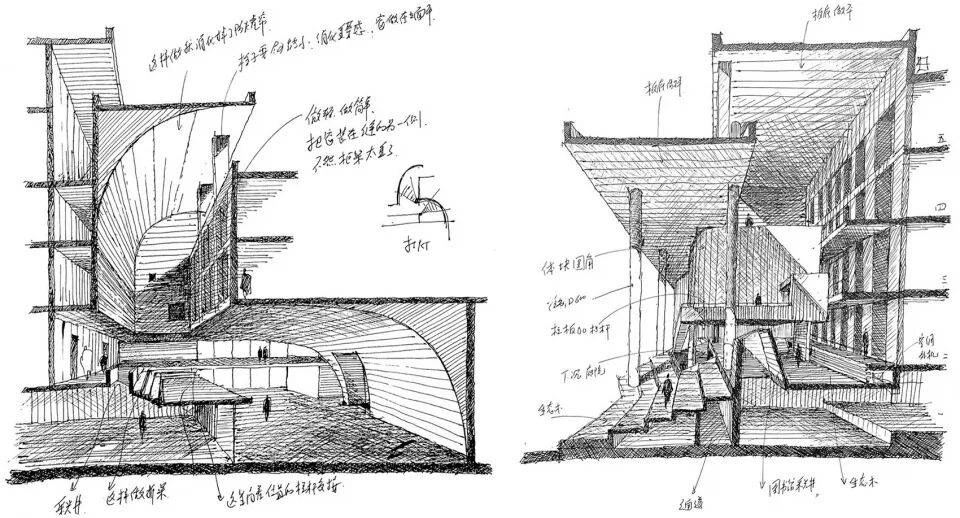 2. 草图推敲的重要性:草图是建筑师设计创作与团队协作的核心工具。从模糊概念到清晰空间形态,再到最终建造逻辑,草图贯穿始终。它承载着建筑师对整体结构、空间秩序与形体关系的系统研究,也记录着对尺度比例、节点构造、材料交接等关键细节的反复探讨,让抽象构想转化为可感知、可实现的设计语言。