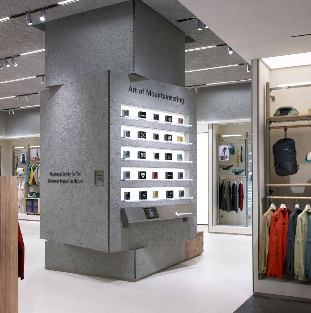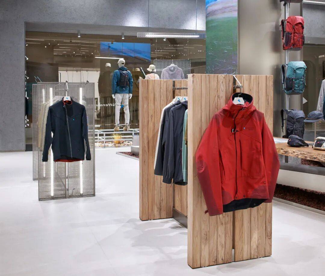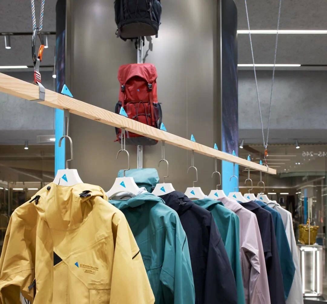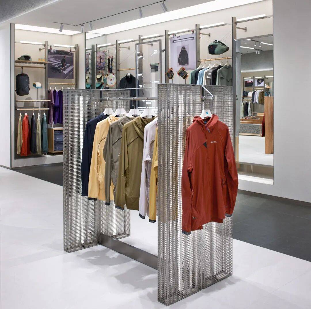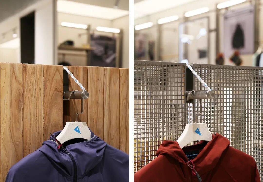 5. 细节设计用心:在细节处,灯管装置、登山绳及卡件等元素丰富了设计细节,体现了空间与材料的连续性和对比性。衣架组合延续展示道具的设计语言,原木材质体现品牌自然、环保理念,金属网格呈现简约、现代设计元素。展示柱一侧橱窗展示装置结合本地文化,背景为大连城市地图,另一侧利用透光亚克力展架陈列最新产品面料,柱面材质采用来源于海洋生物的硅藻泥肌理漆,转角利用登山绳做细节处理,增强设计感。