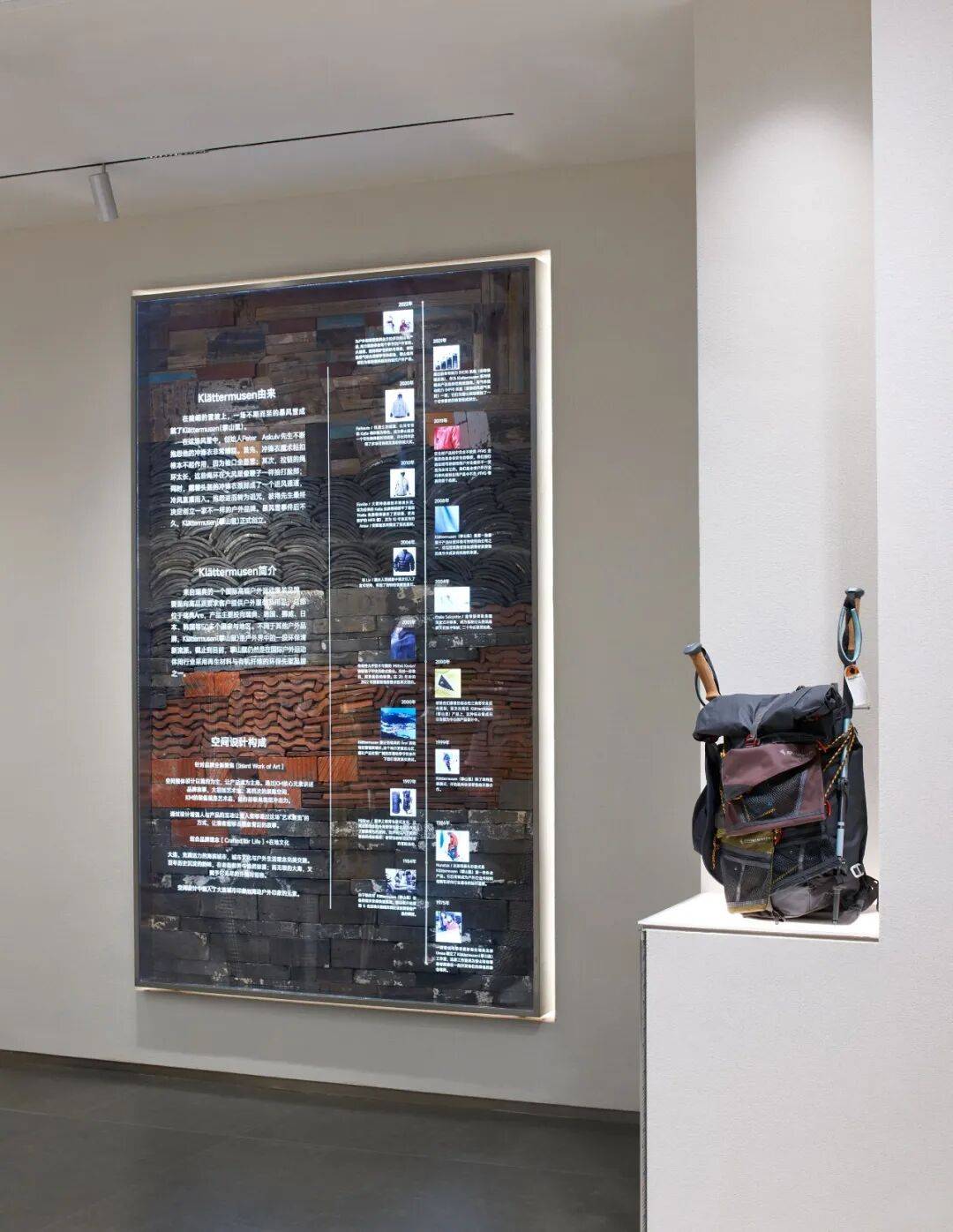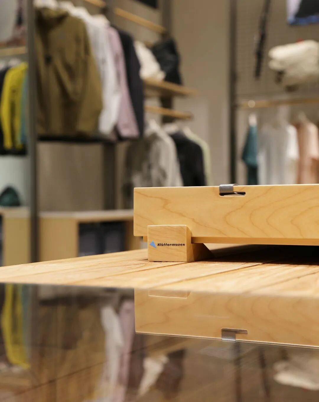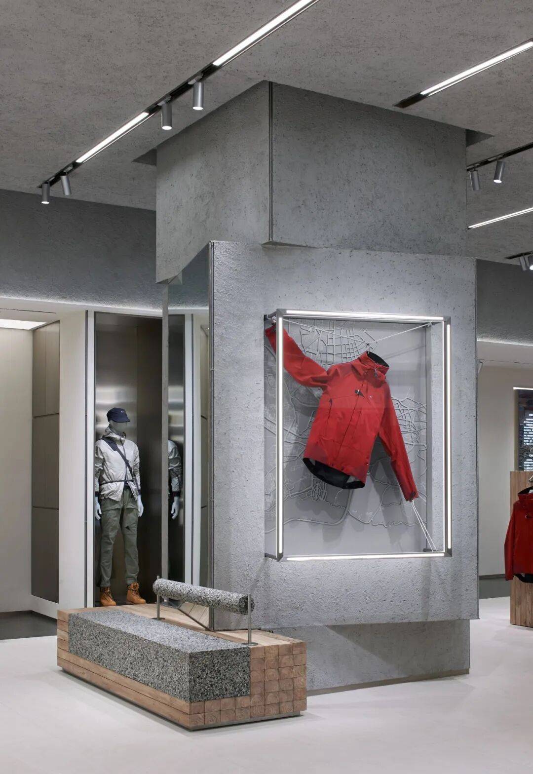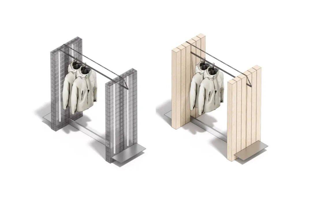 5. 细节设计用心:在细节处,灯管装置、登山绳及卡件等元素丰富了设计细节,体现了空间与材料的连续性和对比性。衣架组合延续展示道具的设计语言,原木材质体现品牌自然、环保理念,金属网格呈现简约、现代设计元素。展示柱一侧橱窗展示装置结合本地文化,背景为大连城市地图,另一侧利用透光亚克力展架陈列最新产品面料,柱面材质采用来源于海洋生物的硅藻泥肌理漆,转角利用登山绳做细节处理,增强设计感。