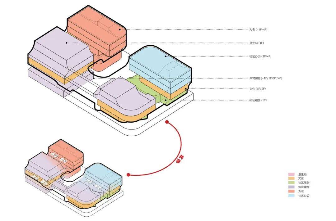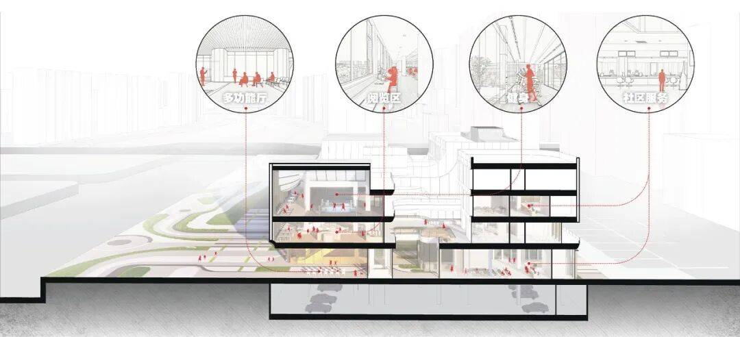 2. 功能分区:综合考虑各功能用房的“开放性”、“目的性”,以“动、静”为原则进行分层组织,再通过公共、老年专用、办公专用和后勤专用四组垂直交通实现楼层之间的组织。首层中央的“社树广场”为公服与幼儿园共用集散场地;南侧挑高灰空间作为滨水体育带的延伸和互补;西侧沿河灰空间设置“下沉式滑板场”;东侧沿河灰空间设置“可开合沿街多功能厅”;内街设置幸福客厅和便民服务设施;卫生站、社区餐厅、老人日间照料中心等设置在首层北侧。二层南侧布置交流性最强的用房;三层设置日间照护的老年活动区;三、四层内侧设置照护休息室和行政管理办公。
