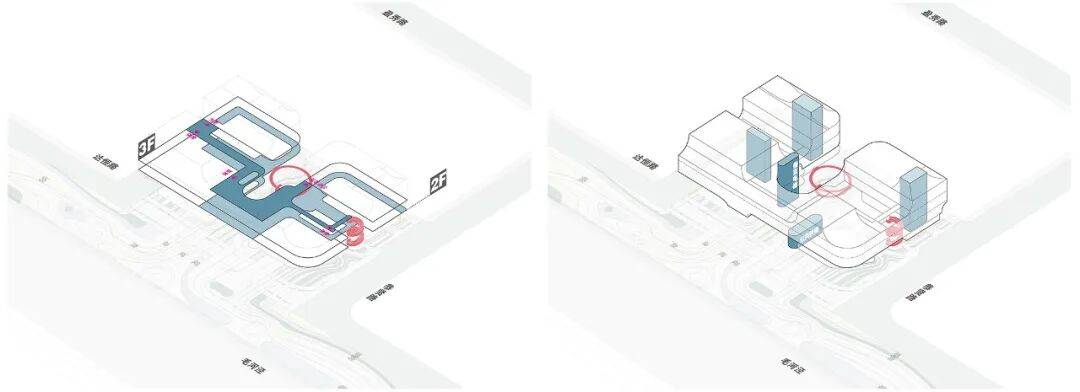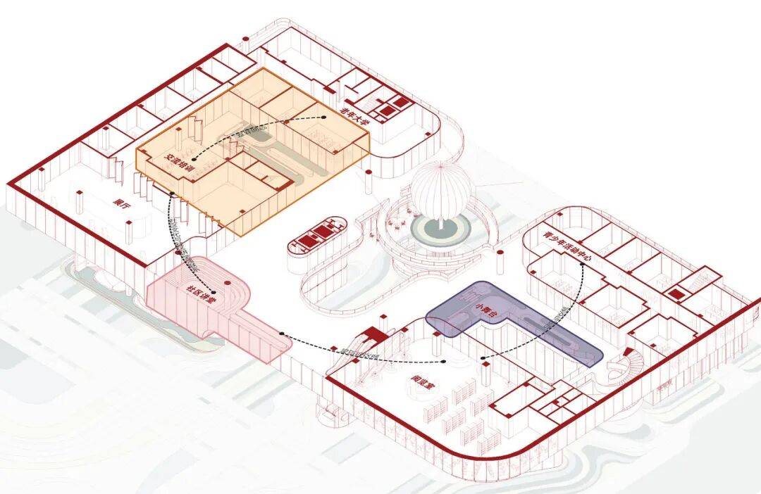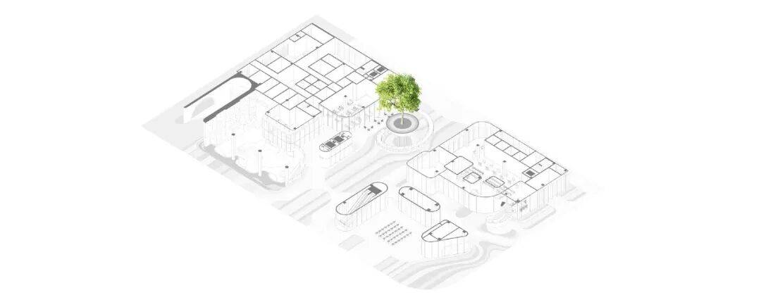 3. 流线组织:基地西南、东北分别设车行进、出口,西南角入口附近设汽车坡道直通地下室,环绕基地的西侧和北侧为急救车专用车道兼应急消防车道,东北角沿路设港湾式停车位,靠近卫生站入口留急救专用车位,还设置地下非机动车库。其余地面均为步行可达范围,设标志性的公共直梯和扶梯各一组连接各层公共走廊,为老区域和行政管理区域设有专用门厅和电梯。同时,有意设计了一些“留白空间”“冗余流线”,如旋转楼梯、下沉台阶和绕着社树的坡道,为青少儿提供更多活动场景。