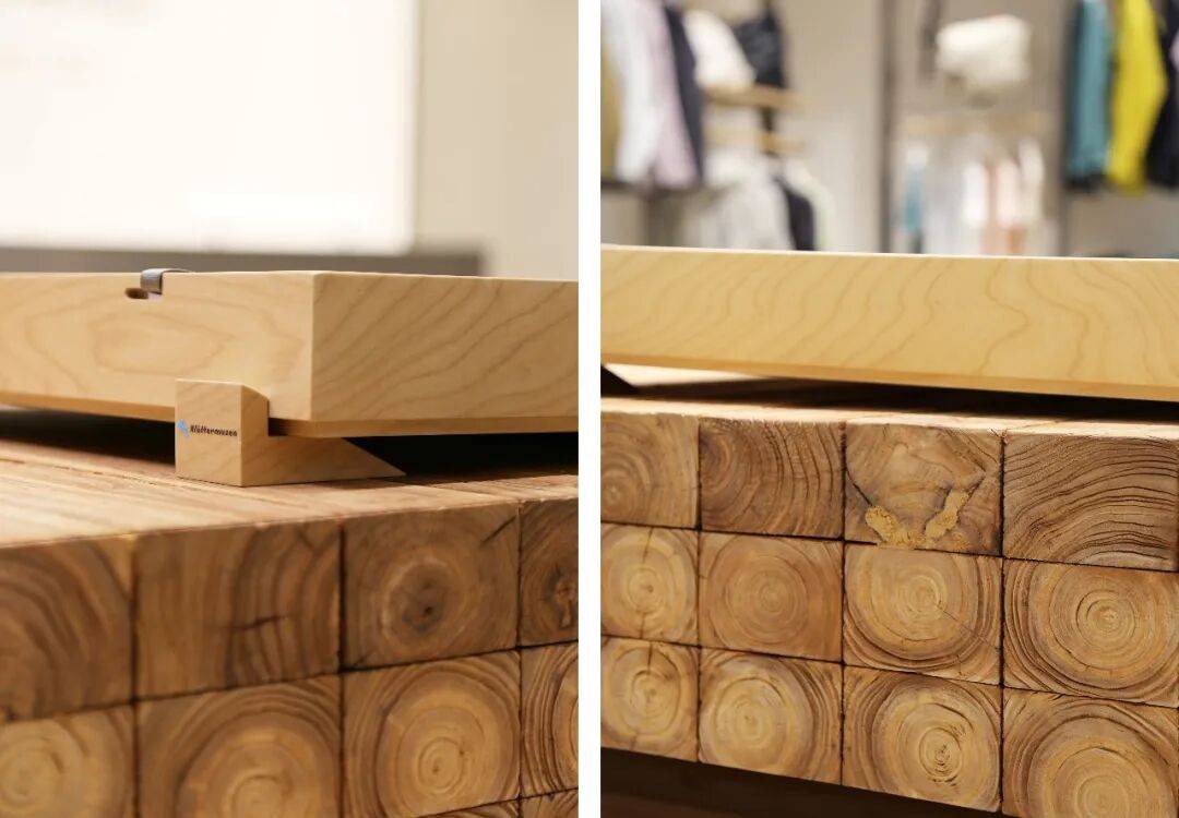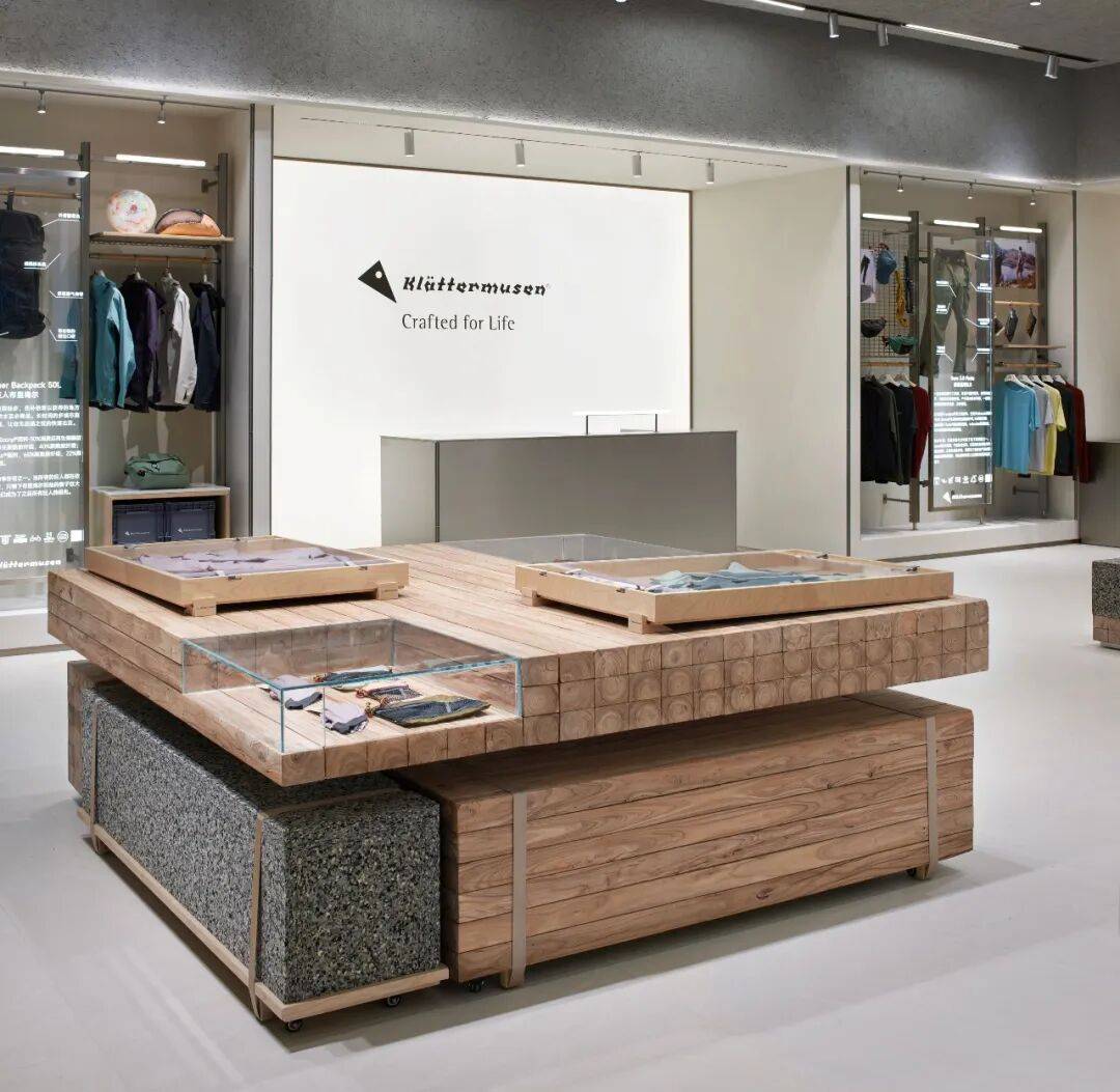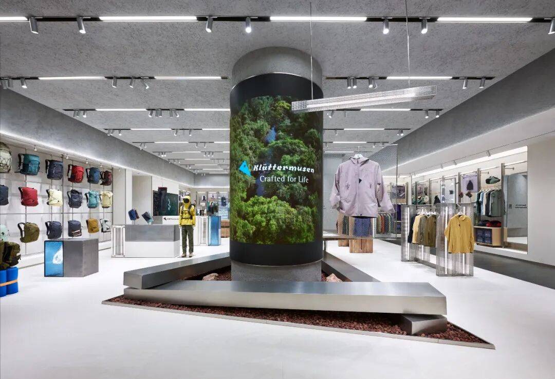 2. 空间语言搭建:通过“新型道具”搭建独特的空间语言。金属框架搭建的橱窗展台以极简造型回应品牌绿色环保理念,装饰元素直观反映大连海洋文化和自然环境。直径1.6米的结构柱结合品牌logo造型,打造成核心展示中岛,360°展示品牌产品和设计理念。中岛另一侧利用登山绳吊挂衣架和天然木一枚板,一枚板内嵌显示屏讲述品牌发展历史,地面铺着大连本地火山岩碎石,延续品牌与自然的对话,且金属底座尖角做了安全处理,加深品牌形象记忆。