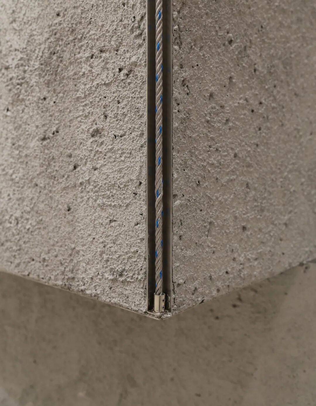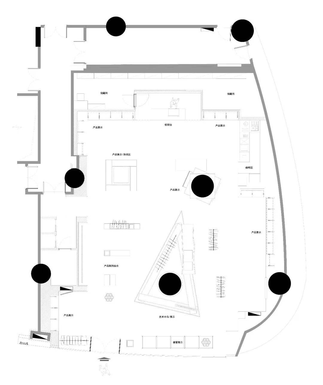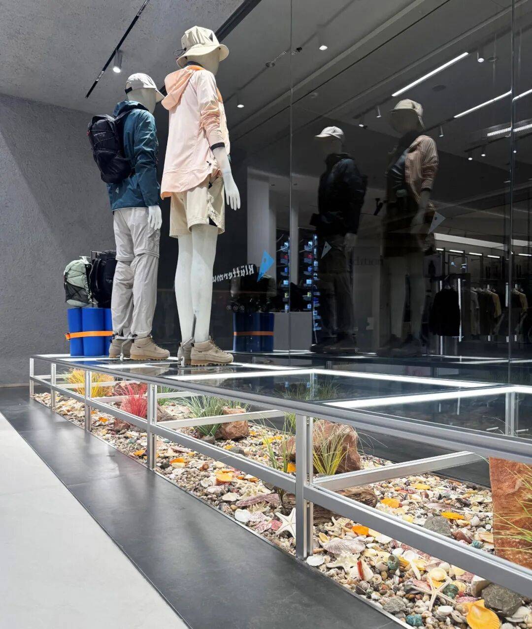 2. 空间语言搭建:通过“新型道具”搭建独特的空间语言。金属框架搭建的橱窗展台以极简造型回应品牌绿色环保理念,装饰元素直观反映大连海洋文化和自然环境。直径1.6米的结构柱结合品牌logo造型,打造成核心展示中岛,360°展示品牌产品和设计理念。中岛另一侧利用登山绳吊挂衣架和天然木一枚板,一枚板内嵌显示屏讲述品牌发展历史,地面铺着大连本地火山岩碎石,延续品牌与自然的对话,且金属底座尖角做了安全处理,加深品牌形象记忆。