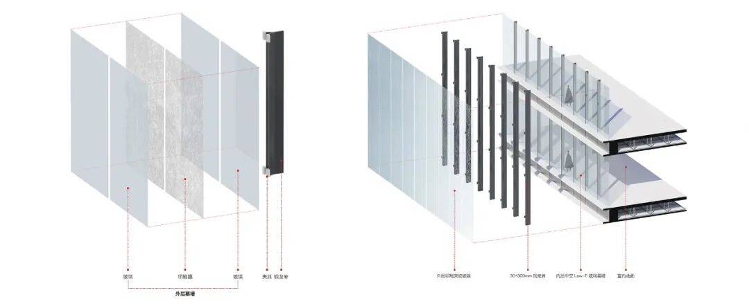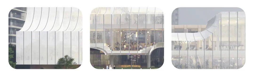 建筑造型水平向舒缓展开,首层架空,形成错落有致的窗景。表皮材料采用白色半透印刷玻璃、特质光伏玻璃等,配合参数化设计手法进行表皮通透性的渐变控制,达到画卷灯般的质感,夜间灯光照明使设计内外共修。