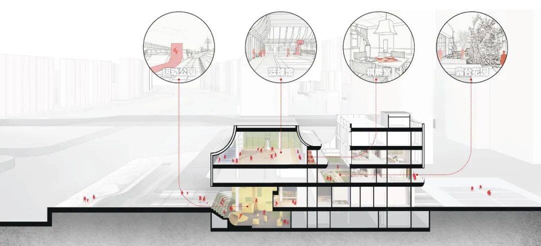 1. “社树”概念引入:设计种下一棵寓意传统、但形象未来的“社树”,迎接新城邻里,搭建一个有“烟火气”的小家之外的“大家”,使新的社区公服成为社区大家庭“老有所依、壮有所用、幼有所长”的场所,各年龄段居民在交流中得到学识和情绪的提升。