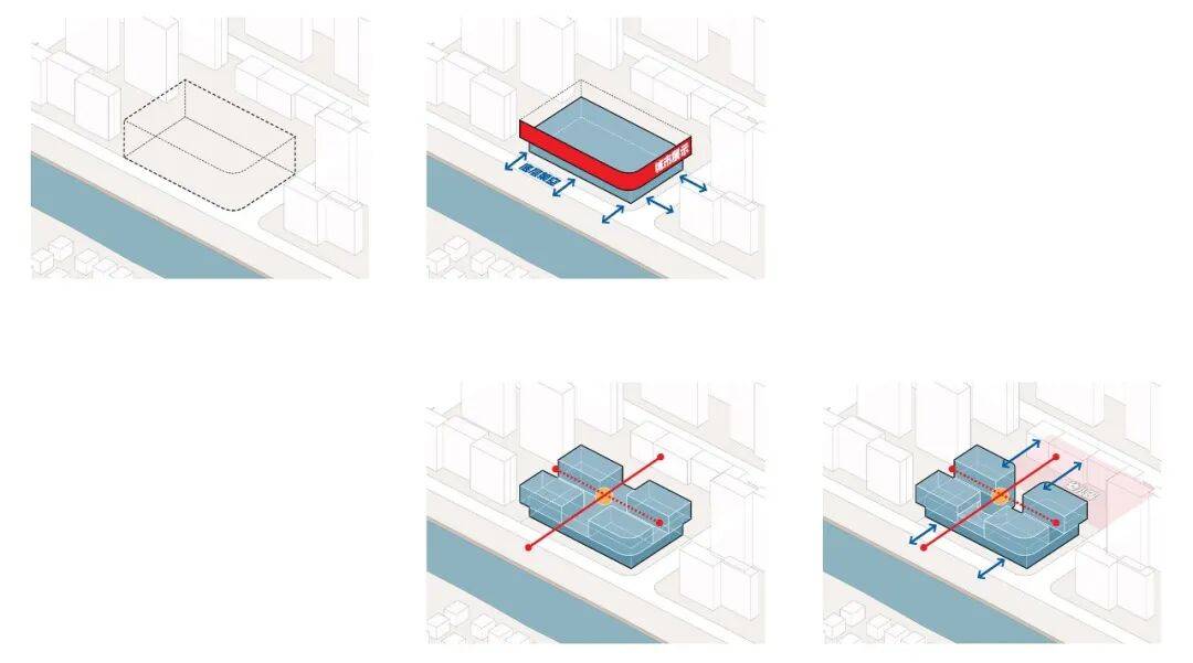1. 场地规划:首层大面积架空,向南侧开放,并与滨河景观带形成渗透;二层以上贴红线建设,中间拉开形成十字型内院,满足不同功能组可分可和的管理需求,提供良好的通风、采光、隔声等物理环境。