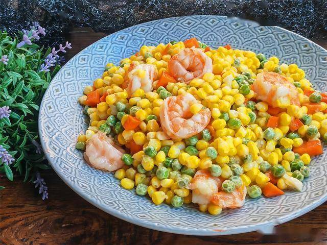【虾仁玉米小炒】所需材料:大虾10个、鲜玉米、青豌豆、胡萝卜、油盐适量、葱1段、姜1片、大蒜2瓣、料酒半汤匙、白胡椒粉 半茶匙、白糖1茶匙、鸡精半茶匙、水淀粉适量、