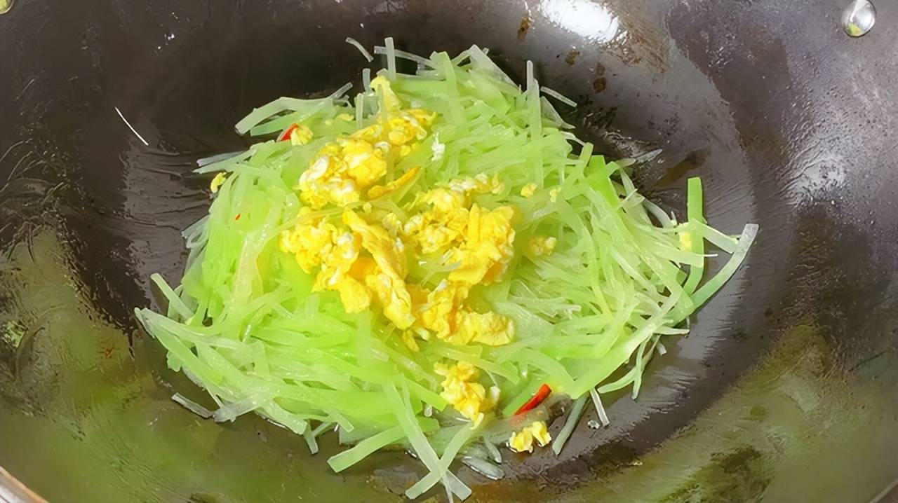 接着把刚才炒好的鸡蛋倒回锅里,跟莴笋丝一起翻炒均匀,再加点盐调味,喜欢吃辣的,可以放几个干辣椒段,炒出来更香。我家都不太能吃辣,就放了点葱花,出锅前撒进去,翻两下就盛盘了。