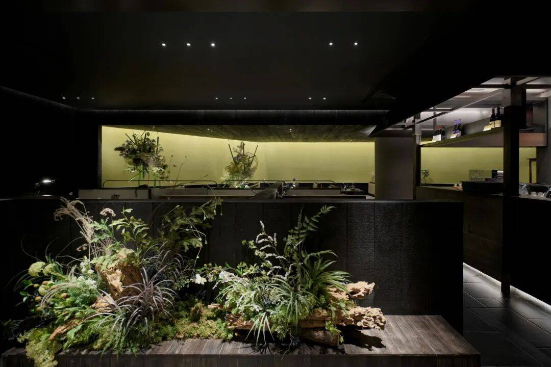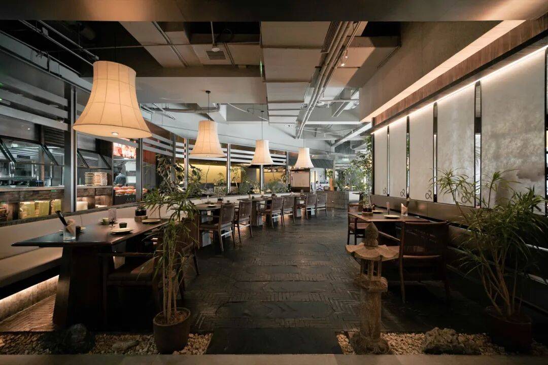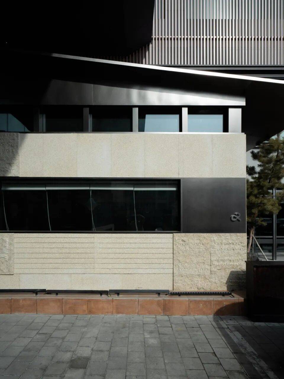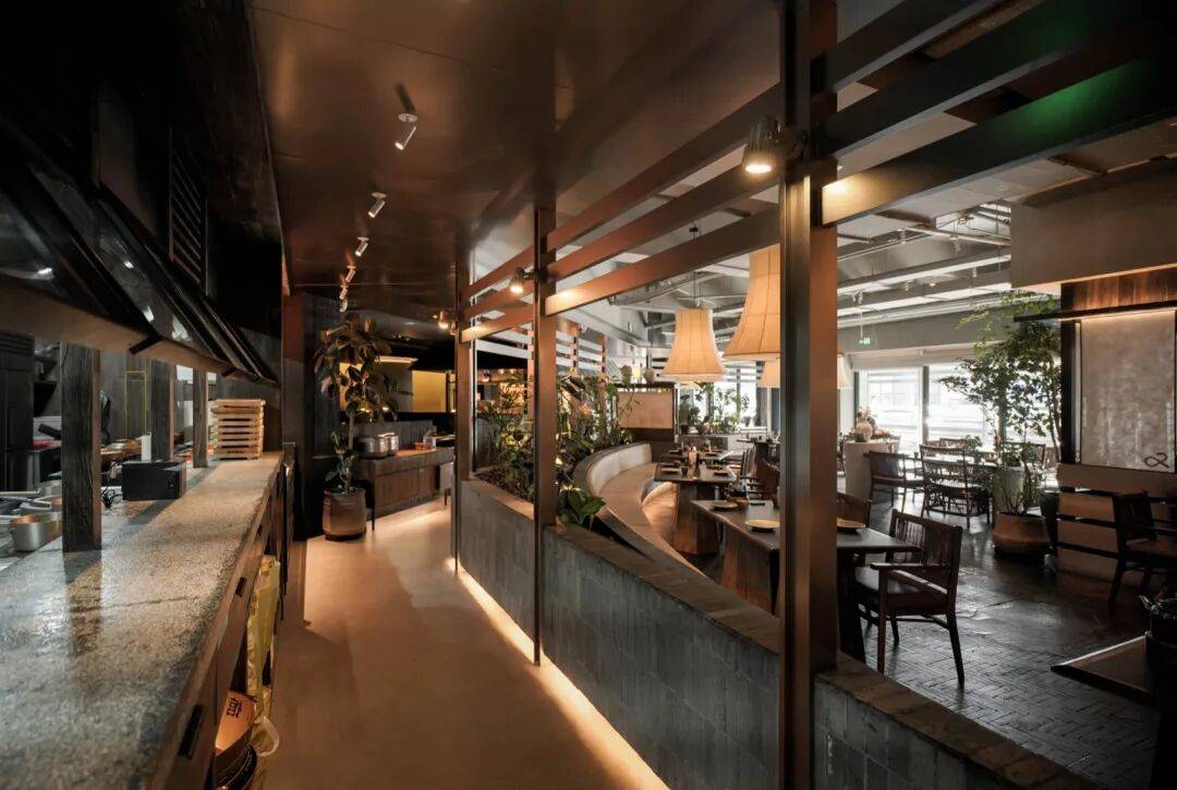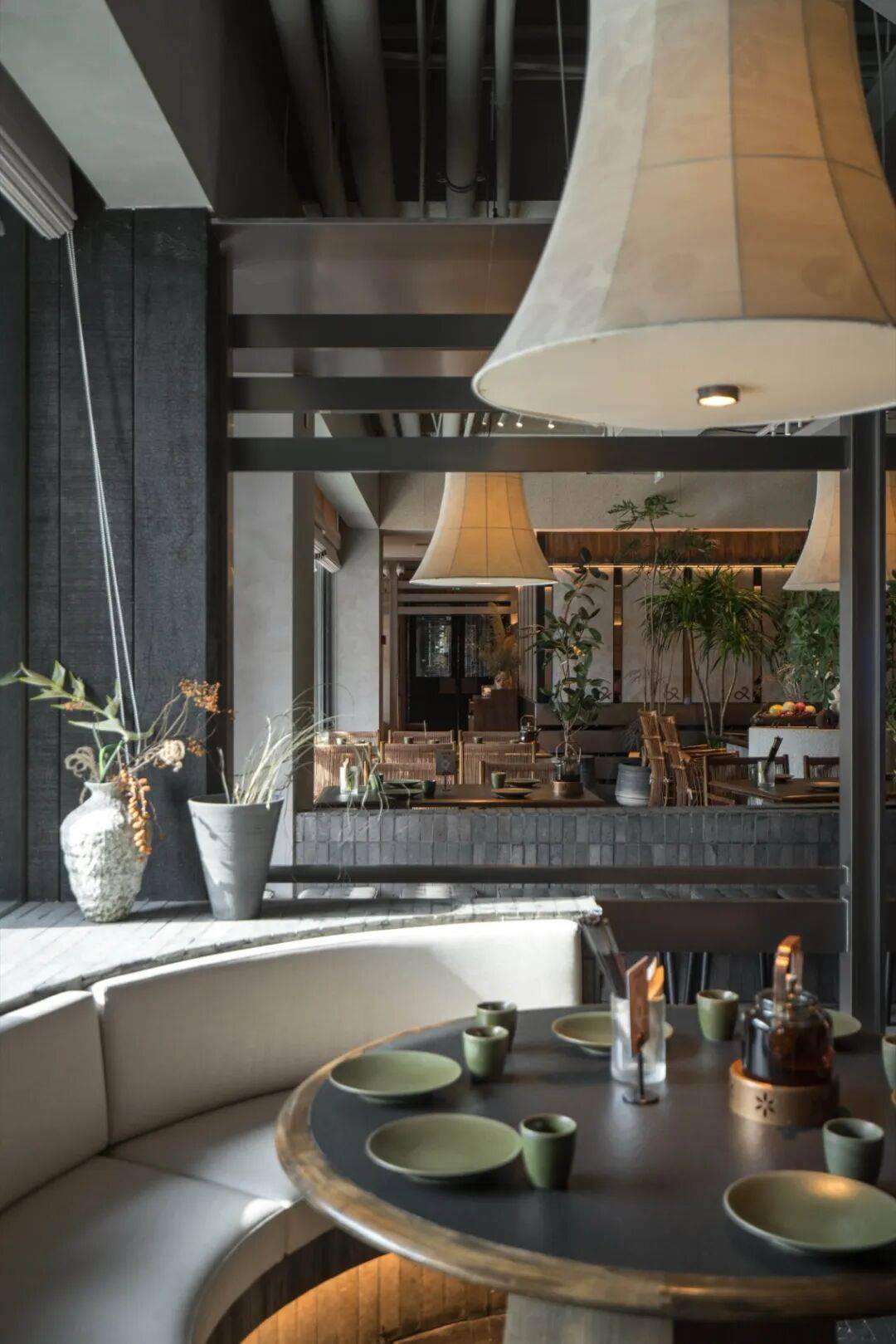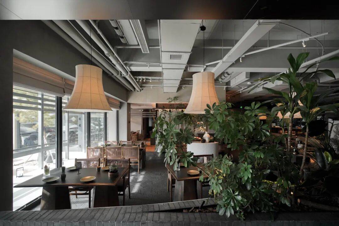 材料的选择服务于“结构化山野”的氛围营造。乱纹不锈钢作为空间的现代框架,与青砖砌筑的矮墙隔断形成质感对比。矮墙之间种植绿植,形成自然柔和的边界。靠墙的卡座区则通过温润的木板墙面与舒适的软包结合,在粗粝自然中融入细腻的体贴。