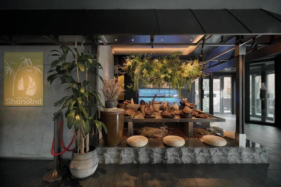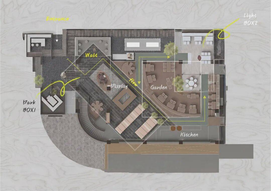 “一山又一山”这一品牌理念蕴含着丰富的内涵。“山”代表着食材、自然以及丰盈的生机,它是川菜滋味的源头;“又”则体现了川人“再来一次”的松弛、悠然与包容态度。在空间设计中,将“又”拟人化为“行走与体验的人”,“山”成为人所处的环境与基底,“又”则化作人在其中的行为与感受。由此,空间的核心概念应运而生——构筑一条“人在山野小径中漫步、探索”的动态旅程,将“箱盒里的山野”作为整体场域,把品牌的诗意主张“见山、见川、见悠然”转化为可身体感知、充满发现与从容节奏的空间叙事。