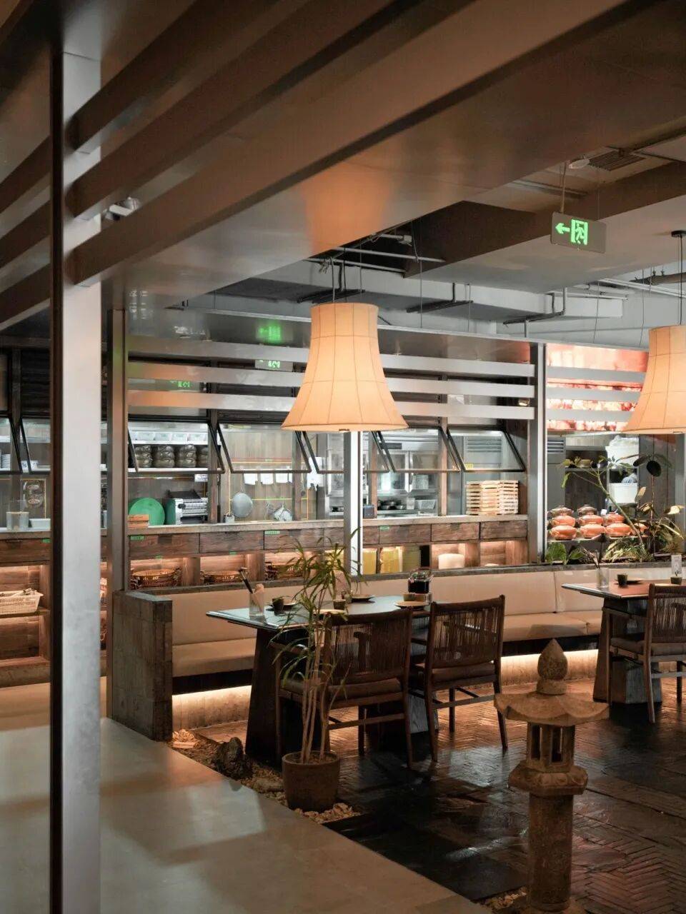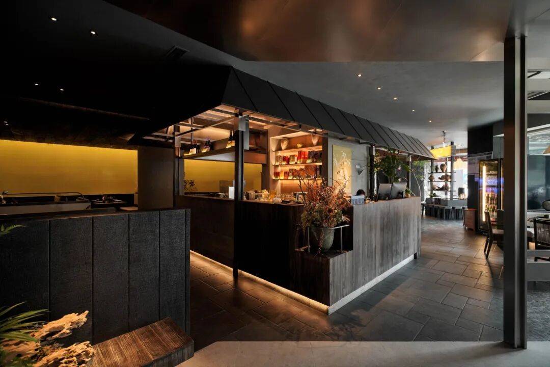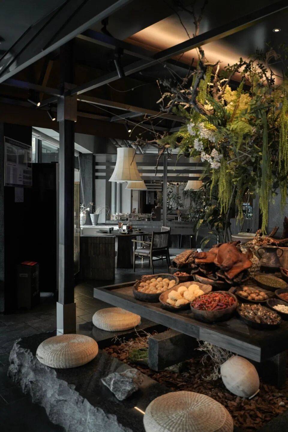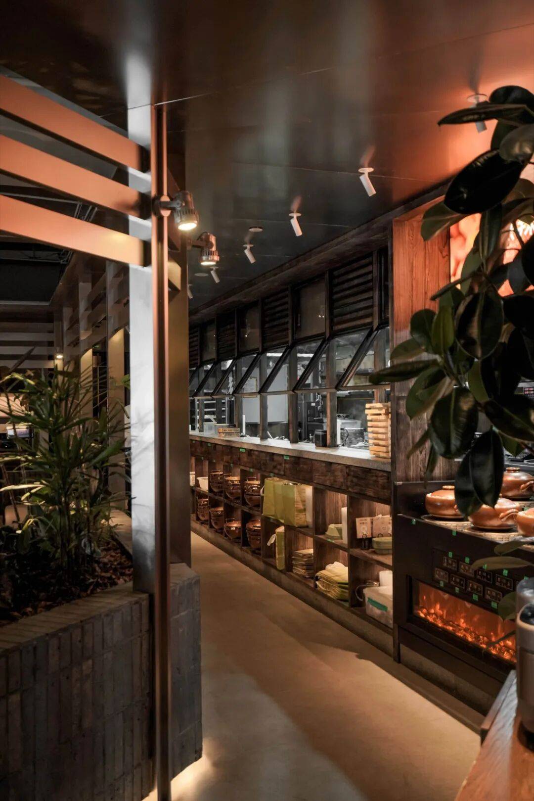 入户与等位区保留了开阔的空间,以陶罐展陈形成柔性隔断,营造出熙攘的初印象。路径一侧设置独立食材展示区,采用黑色地砖、花岗岩与炭化木构架出静谧背景,再由聚焦的暖光点亮,成为空间中第一个富有仪式感的视觉焦点。宽敞的等位区也为后续运营中的热闹氛围提供了可能。
