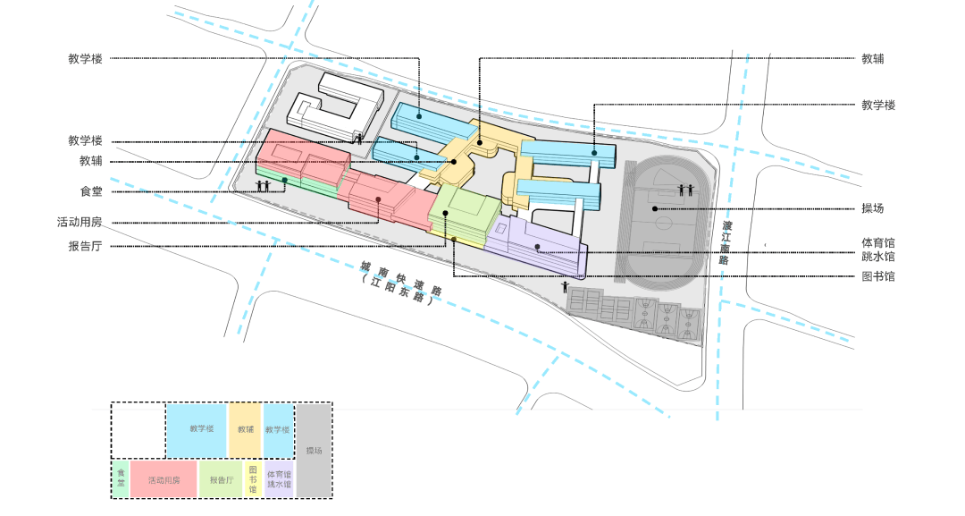 通过总图空间规划与功能整合,实现社会资源的高效整合,有效规避南侧快速路的噪音干扰,保障校园内部静谧环境。以简洁大气的建筑形态塑造出规整有序、富有亲和力的城市界面,让校园深度嵌入城市肌理,成为兼具教育功能与公共活力的核心节点,达成校城之间资源共享、功能互补、共生共荣的良性互动。