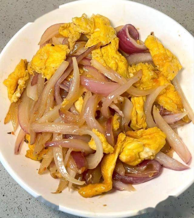 6. 大火快速翻炒均匀,让鸡蛋吸收洋葱的甜味,翻炒30秒即可。