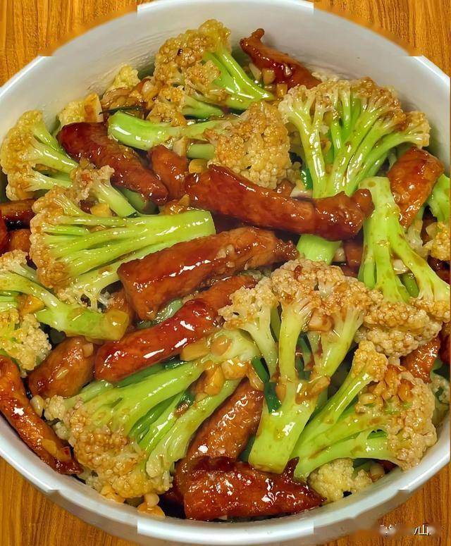 5. 调味出锅:加入生抽、老抽、蚝油、盐,继续大火翻炒30秒让花菜均匀上色。花菜脆中带软,吸饱了五花肉的油脂,比肉还好吃!