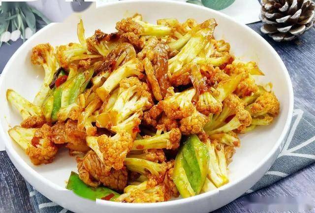 5、继续煸炒至花菜表面微微焦香,出锅前撒上葱段,翻拌均匀即可装盘。