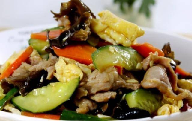 1. 猪肉切丝,用生抽、淀粉腌制。木耳、胡萝卜、青椒切丝备用。