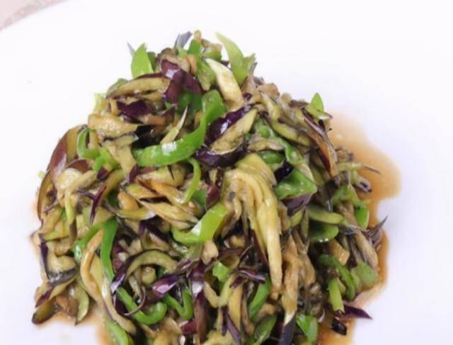 小贴士:茄子先用盐腌制出水,减少吸油量,炒制时加入青红椒增加色彩和口感。